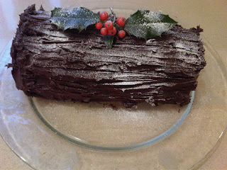 7. Re-roll and place on a plate or silver board. Spread the reserved chocolate mixture evenly over the top and sides. Mark with a fork so that the surface resembles tree bark. Just before serving, decorate with holly and a sprinkling of icing sugar to resemble snow.